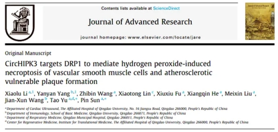 The rupture of vulnerable atherosclerotic plaques is the cause of most acute vascular syndromes. Recently, Professor Yu Tao's teamfrom the Institute ofTranslational Medicine published an online paperentitled "CircHIPK3 targets DRP1 to mediate hydrogen peroxide-induced necroptosis of vascular smooth muscle cells and atherosclerotic vulnerable plaque formation" in the "Journal of Advanced Research" (the Chinese Academy of Sciences ranking Q1,IF=11.4). This research was supported by the National Natural Science Foundation of China,the Natural Science Foundation of Shandong Province, and Qingdao Science and Technology Bureau.The first author is PhD student Li Xiaolu from the Medical Department, and the corresponding authors are Professor Yu Taoand Dr.Sun Pin from Qingdao University.