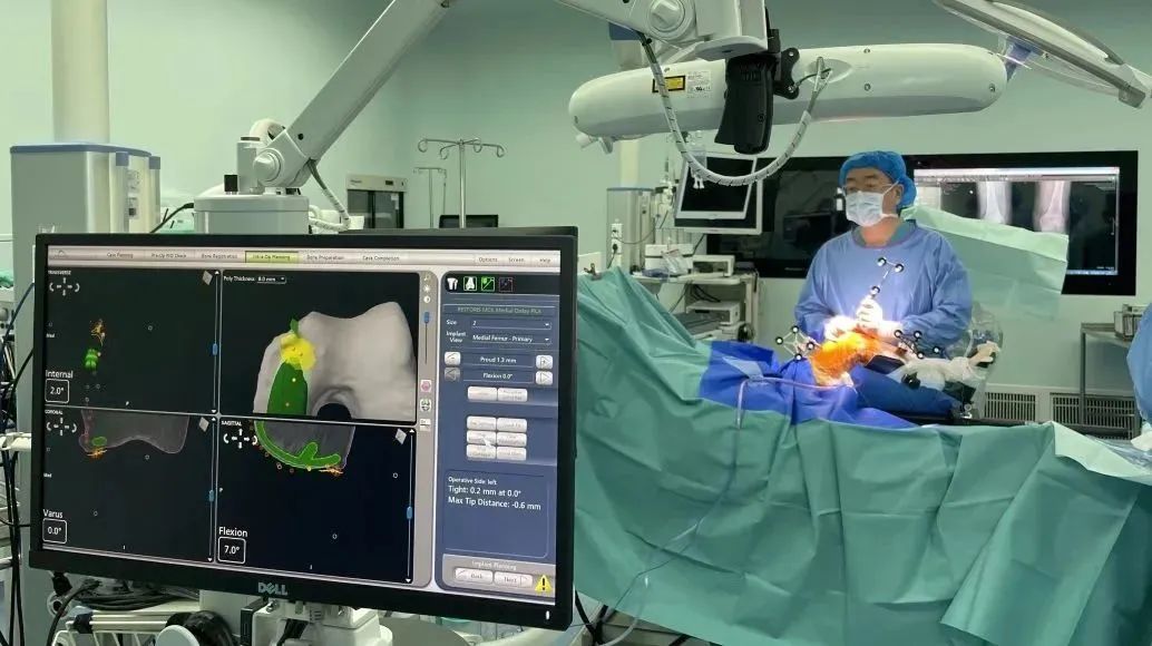 张海宁教授认为,患者为高龄女性,行单间室置换可进一步减小手术创伤,减少手术时间及术中出血,增加围手术期的安全性,加快术后康复。为进一步提高手术的精准性,张海宁教授团队在术前对患者进行了下肢CT扫描,并根据其膝关节的个体解剖学特点,采用机器人术前智能规划系统进行模拟规划,评估术前及术后下肢力线、膝关节活动轨迹等参数,为患者量身打造了最符合其解剖学特点的假体安放位置和手术方案。